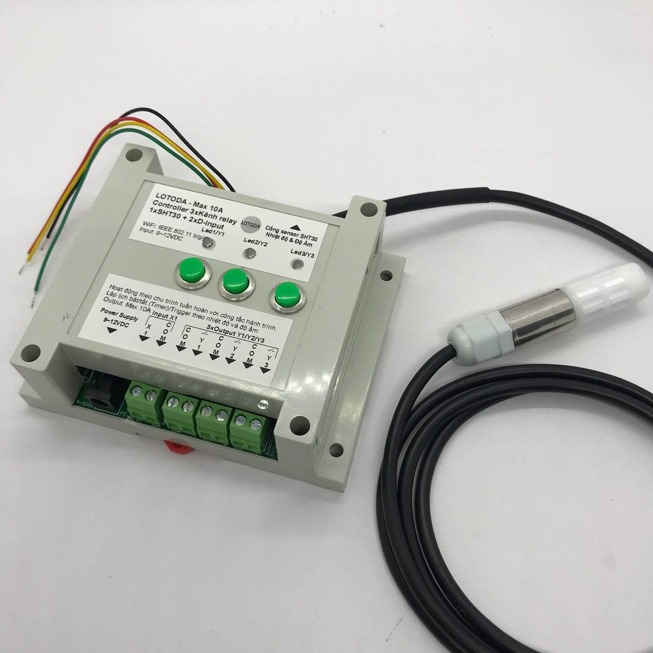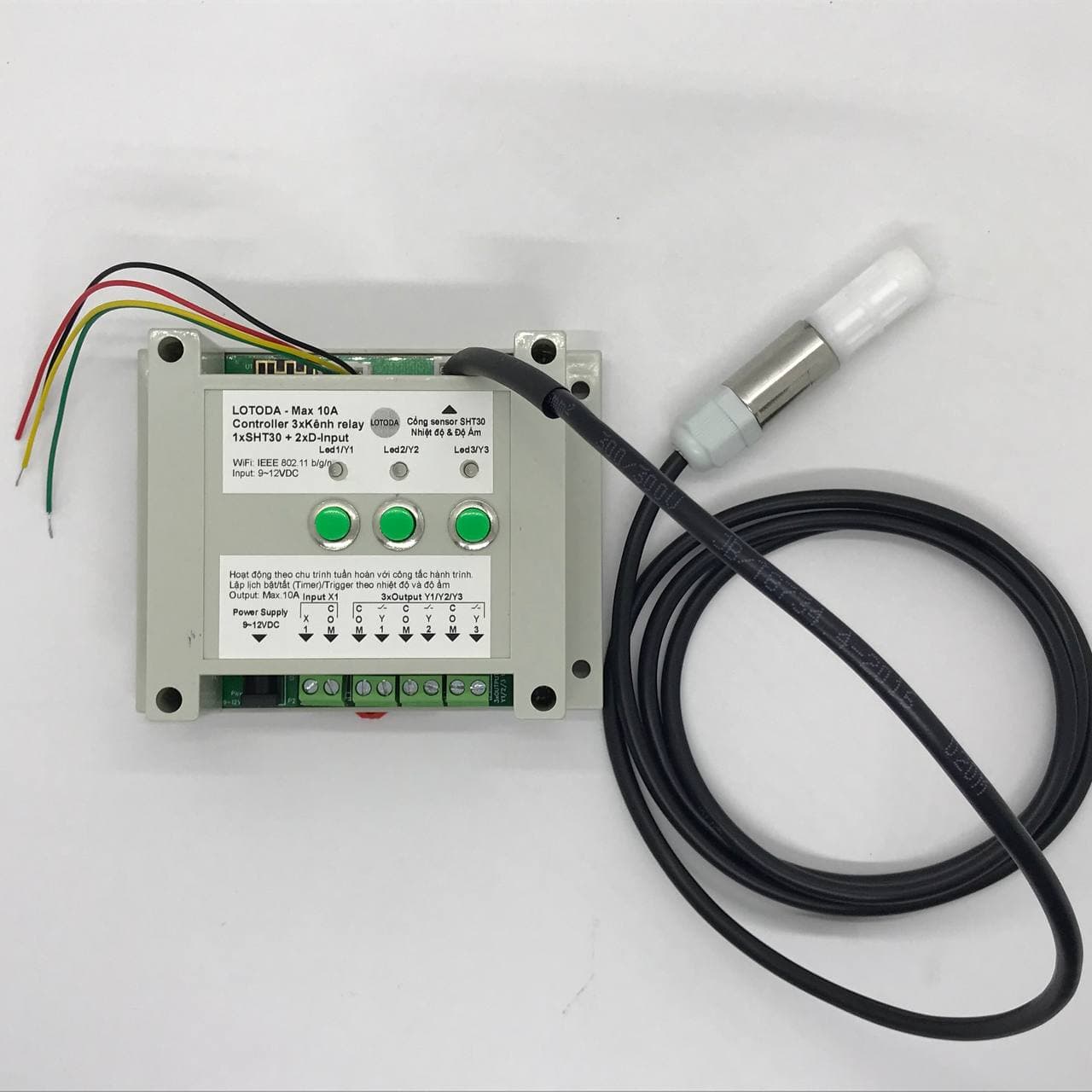 Là thiết bị có gắn sensor I2C SHT30 giám sát nhiệt độ và độ ẩm, độ chính xác cao, và bật/tắt kênh relay theo ngưỡng nhiệt độ và độ ẩm người dùng thiết lập.